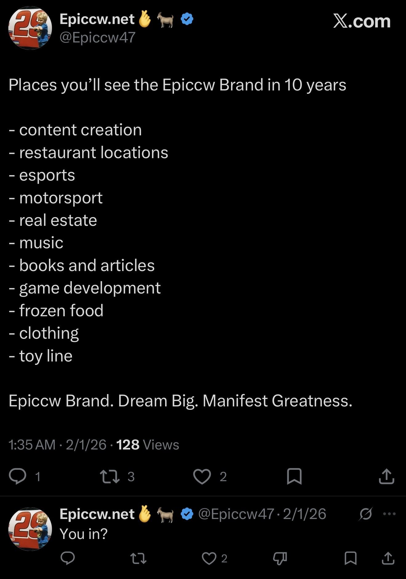 On Feb 1st 2026 I make a post on X of all the places the Epiccw brand would be in 10 years. I really want to make these goals happen. I believe we can do it. Of course being realistic will some fail yes, will some just never happen yes of course but you gotta dream big, be ambitious and never let that drive to be successful fade!